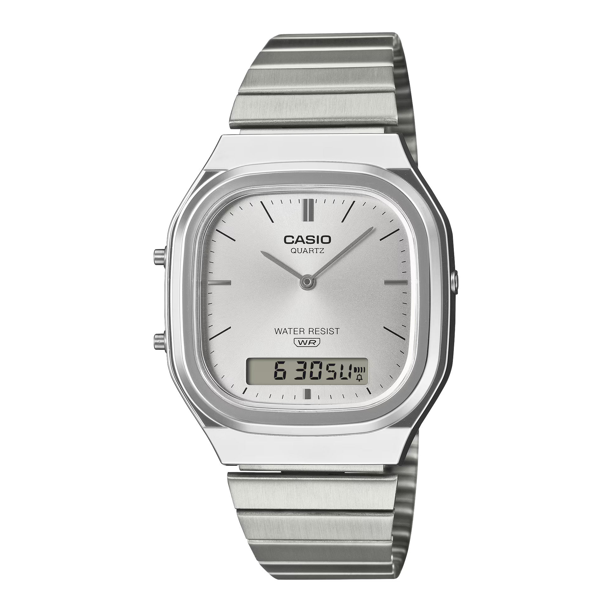 Give your retro style a modern twist, or your contemporary fashion a vintage touch. Either way you go, the refined and flowy AQ-240E strikes the right chord. The analog-digital AQ-240 with dual display goes retro-modern. With a slightly rectangular face offset by a gently rounded case and soft metal curves, this watch exudes sophistication. The sun-ray finish on the dial catches the light with a lustrous glow. Metallic indexes that blend a vintage feel with a modern aesthetic add another eye-catching touch. The digital LCD at the 6 o’clock position offers outstanding readability while maintaining a harmonious overall design, creating a timepiece that’s both functional and beautiful.