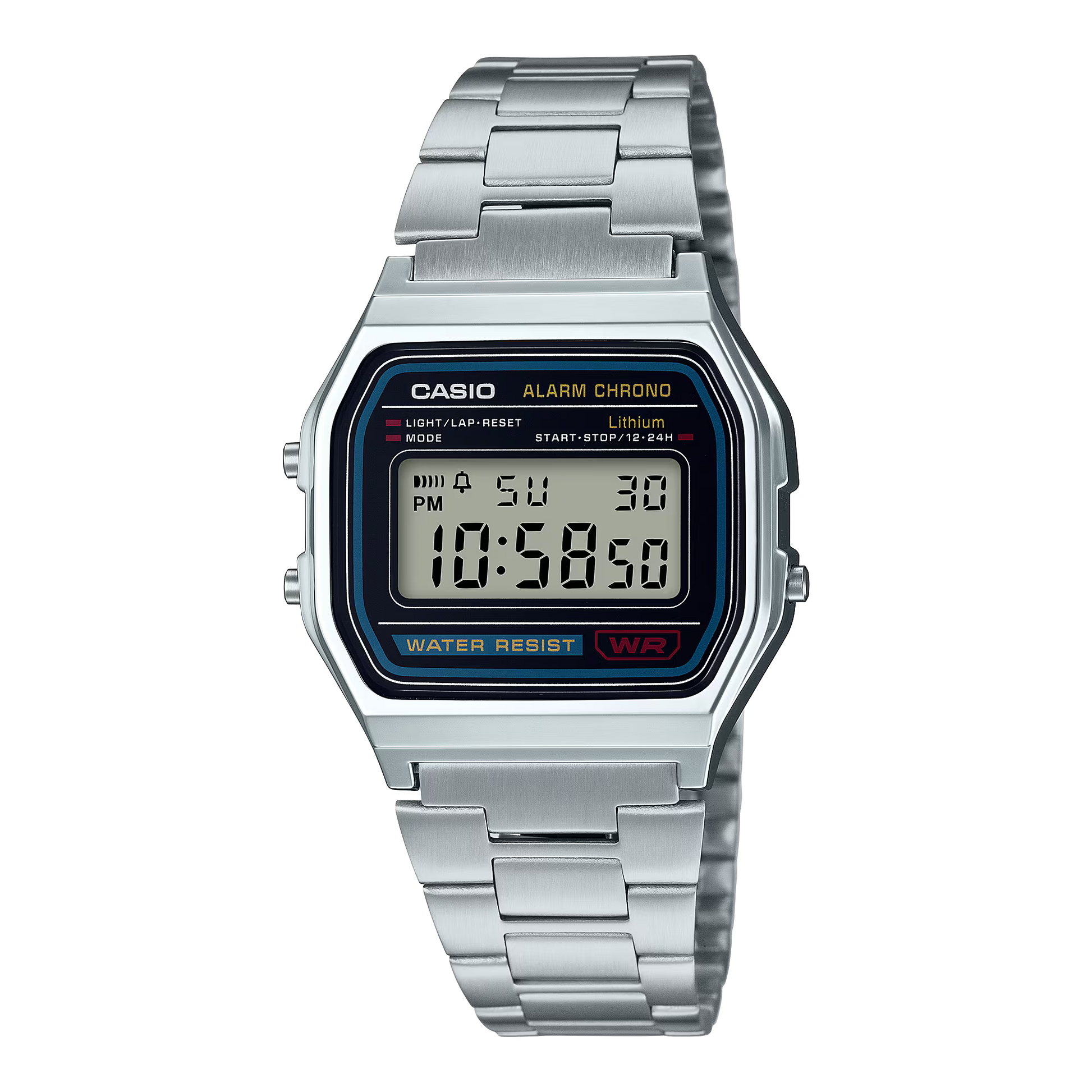 • 1/100-second stopwatch • LED light • Stainless steel band • Water resistant • Square face