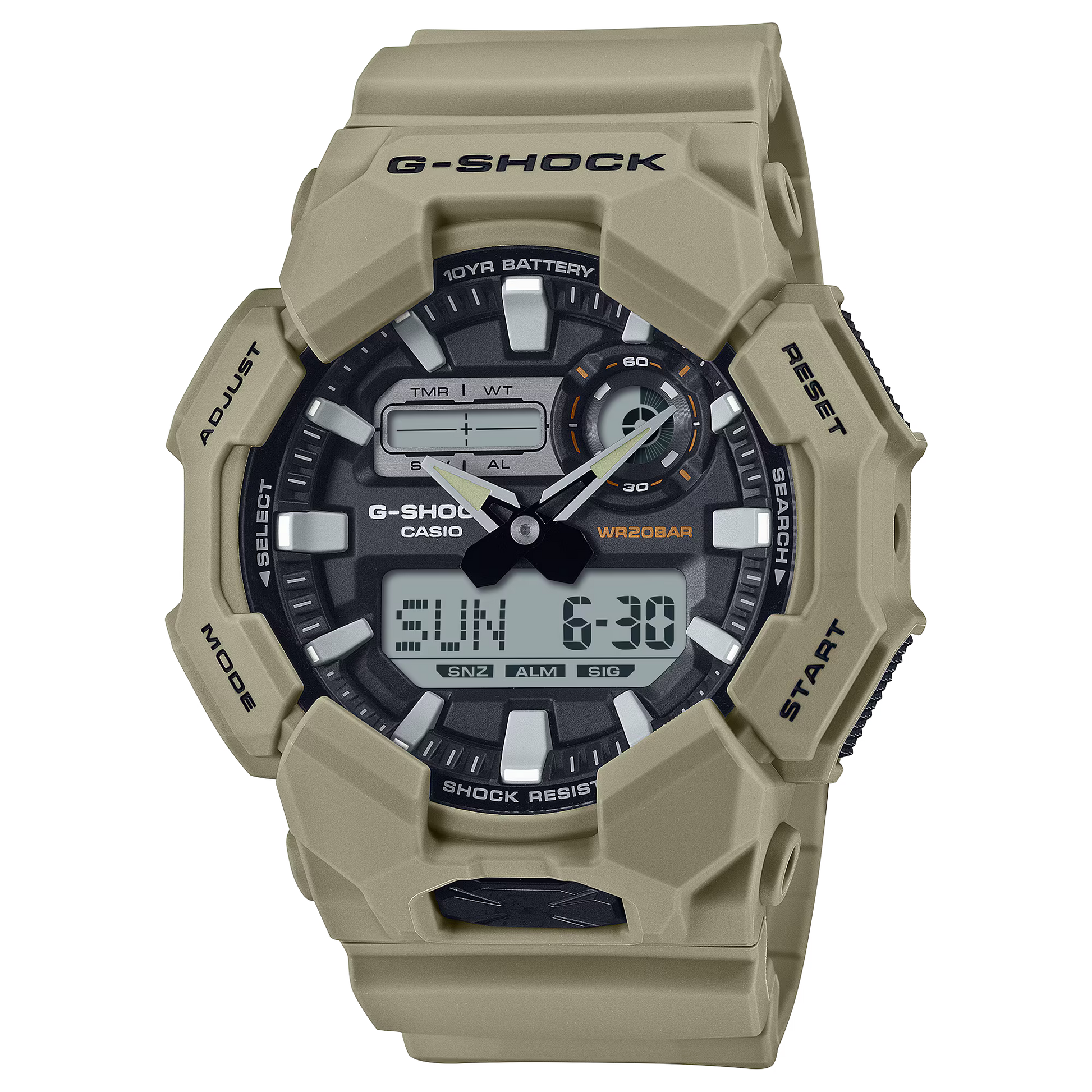 Enjoy a life of fewer battery changes with a large-case G-SHOCK with a 10-year battery you won’t have to worry about for ages. The analog-digital GA-010 delivers handy features like world time and stopwatch, as well as a high-brightness LED light, which can be easily accessed from the large button on front of the case, ensuring visibility even in the dark. Made with bio-based resin and equipped with a 10-year battery, this G-SHOCK is great if you want to reduce environmental impact. Available in a selection of black-based workstyle color schemes for a cool design that moves with ease from casual settings to work situations.