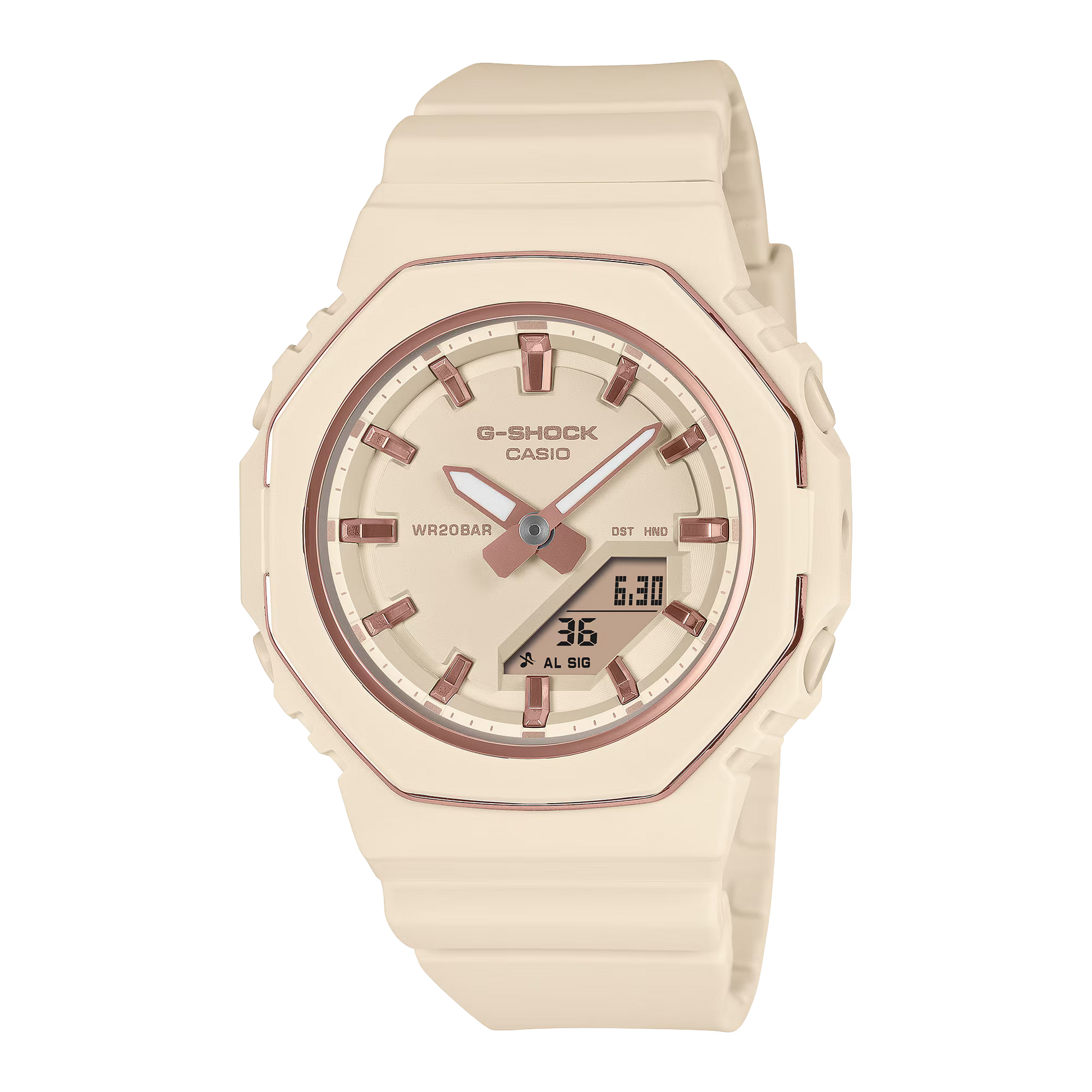 A real standout in the popular digital-analog line of G-SHOCK watches, the GMA-P2110 features a slim metallic ring that catches the light from both the inner and outer edges of the bezel. While comparable to the GMA-P2100 in compact size and comfortable fit, this watch adds an elegant, contemporary touch with the subtle shine of metallic accents. The streamlined bezel leaves out logos or mode indicator engravings for a cleaner, more minimalist finish. Bar indexes are shaped with sharper definition compared to those of the GMA-P2100 watches